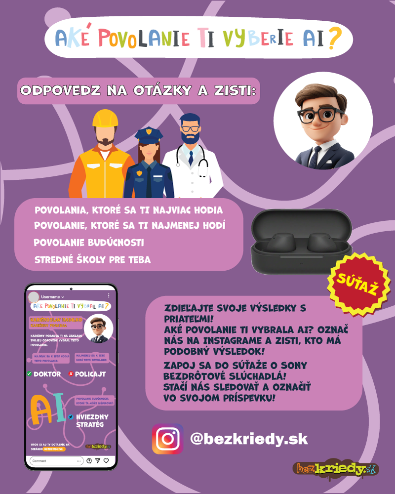 dnes sa pod záštitou portálu BezKriedy.sk uskutoční online Veľtrh stredných škôl pre žiakov ZŠ. Súčasťou akcie je atraktívny Zábavný výber SŠ s UMELOU INTELIGENCIOU. Po vyplnení online dotazníka, AI poradca – Kariéroslav Radilko žiakovi vyhodnotí jeho odpovede a poradí najvhodnejšie povolanie. AI vygeneruje aj zábavný obrázok s doporučenými povolaniami, ktorý sa dá zdieľať na Instagrame. Žiaci sa o sebe môžu dozvedieť niečo nové, možno niečo, čo o sebe doteraz nevedeli a určite niečo zábavné 😊.